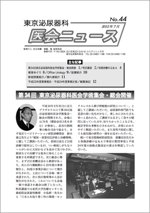 第34回東京泌尿器科医会学術集会・総会開催/特別講演/保険診療のQ&A/教室めぐり/Office Urology/図書紹介/新規開業紹介/隠れ家紹介/平成23年度事業報告・平成24年度事業計画/編集後記